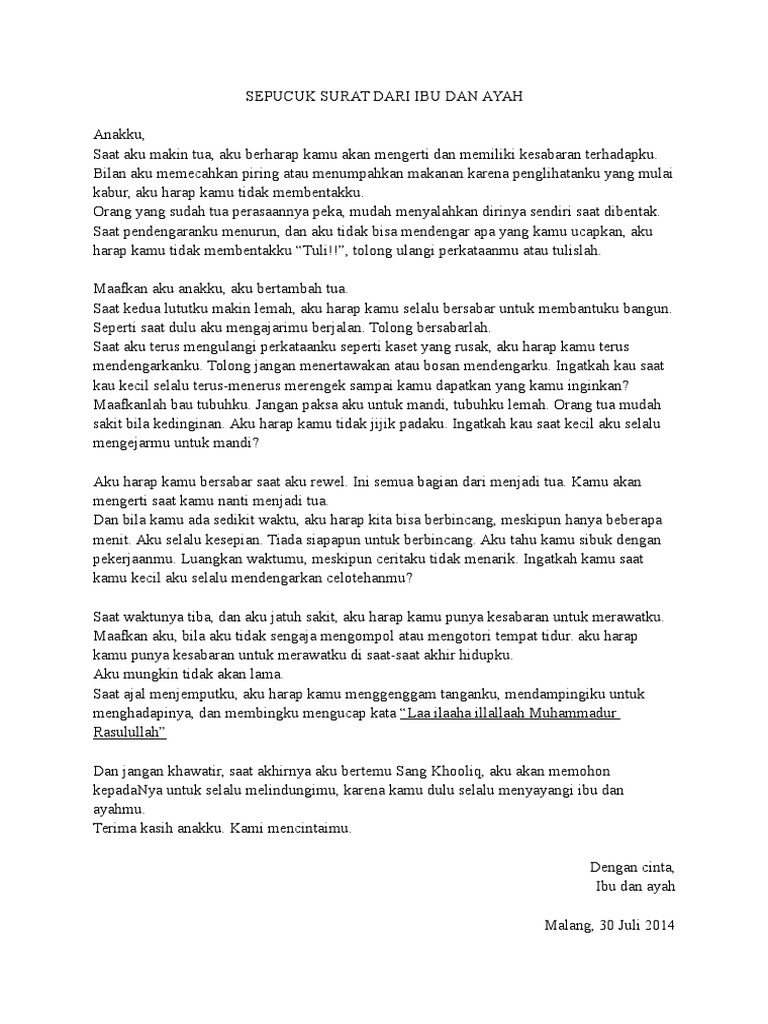 Download sepucuk surat dari ibu dan ayah. Saat mereka tua mere. Itulah sepucuk surat dari ayah dan ibu yang dapat admin kumpulkan. A letter from Mam and Dad.