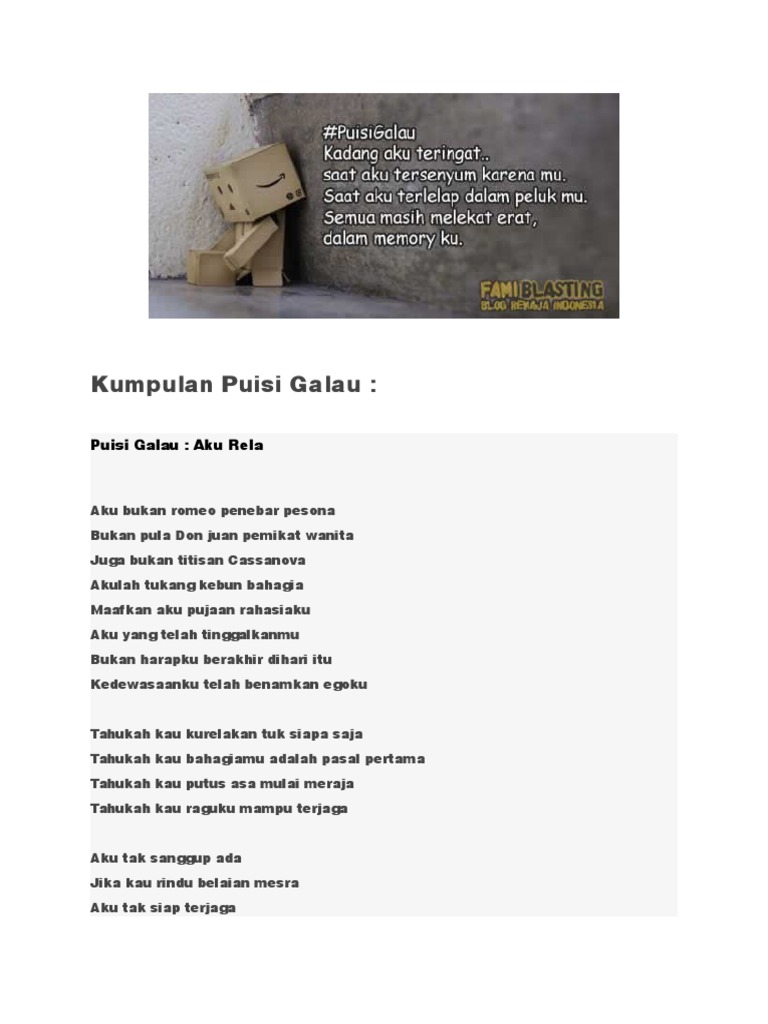 Download puisi galau. Karena telah mencapai batas maksimum. Puisi CintaSemua orang memiliki sisi romantis namun tidak. Itonk Lucky OfficialLara Ati -.